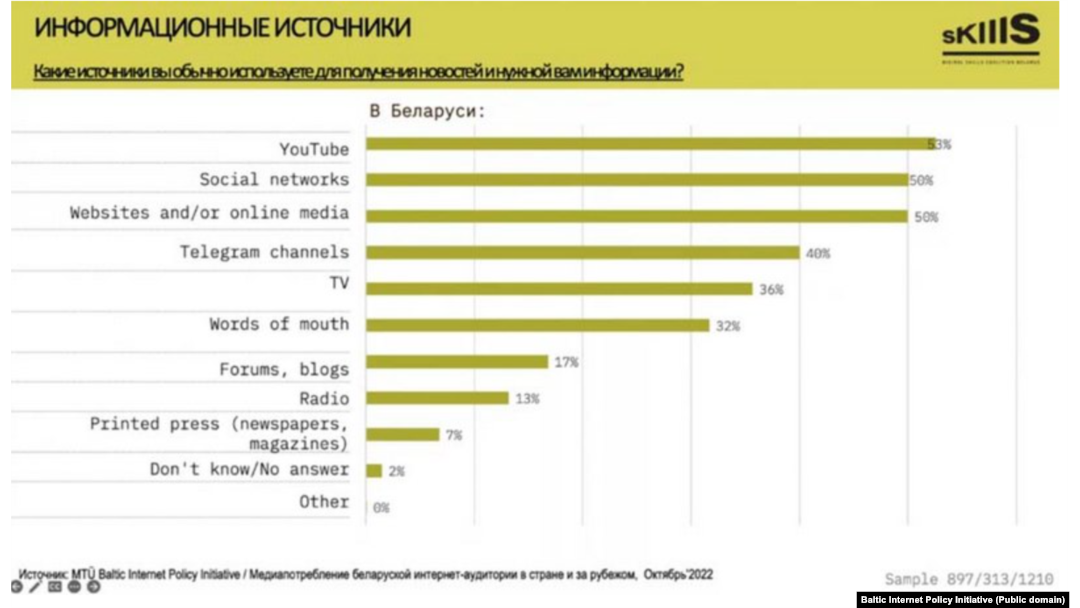 — Наколькі вялікая ў Беларусі аўдыторыя Youtube, як яна суадносіцца з аўдыторыяй тэлебачаньня? Згодна з апытаньнем, праведзеным Інстытутам сацыялёгіі НАН мінулай восеньню, ТБ — асноўная крыніца інфармацыі для 60% беларусаў. Апытаньне беларускай інтэрнэт-аўдыторыі, якое правяла тады ж Baltic Internet Policy Initiative, паказала іншую карціну: Youtube — на першым месцы, а ТБ — на пятым. Каму верыць?