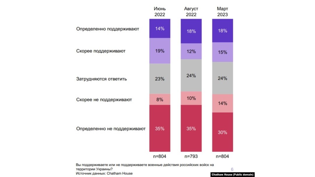 Паводле вынікаў апытаньняў, прадстаўленых на прэзэнтацыі, беларусы падзеленыя ў сваім стаўленьні да вайны Расеі супраць Украіны. Пры гэтым колькасьць праціўнікаў ваенных дзеяньняў Крамля крыху большая, чым доля тых, хто іх падтрымлівае. Зь сярэдзіны мінулага году ў беларускай грамадзкай думцы адсутнічае значная дынаміка зьменаў у адносінах да вайны.